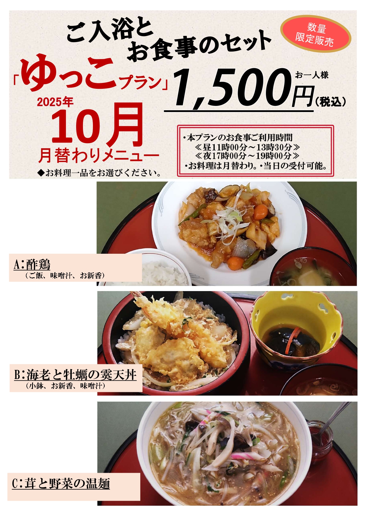 秋の弁当プランはお食事代、ご入浴料、